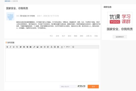 本次活动紧扣全民国家安全教育日重要契机,立足当前传统安全与非传统安全风险交织叠加的新形势、新背景,设置两大主题学习环节。活动前期,学院组织全体同学线上观看国家安全教育专题影片与典型案例教学课程,系统学习国家安全相关法律法规及政策常识。同时引导学子深入思考、感悟所学,在“易伴云”微社区积极分享交流,撰写并发布不少于200字的学习心得体会。
